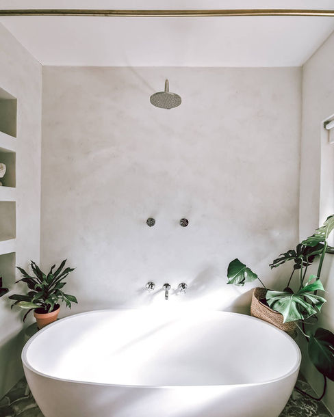 This serene bathroom was designed to give guests a relaxing holiday feeling. We used warm tones and natural textures to give a bit of character to a minimal design. The tiles are handmade, and the walls are covered with Cemcrete that is water resistant, so no need for wall tiles and grout lines. We opted for a freestanding stone bathtub for maximum luxury. Custom made brass details were used to keep it natural and warm and imperfect, as a nod to the original fittings we had to remove during the renovation.